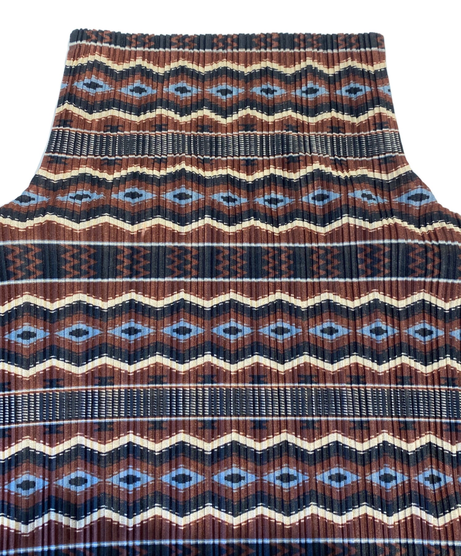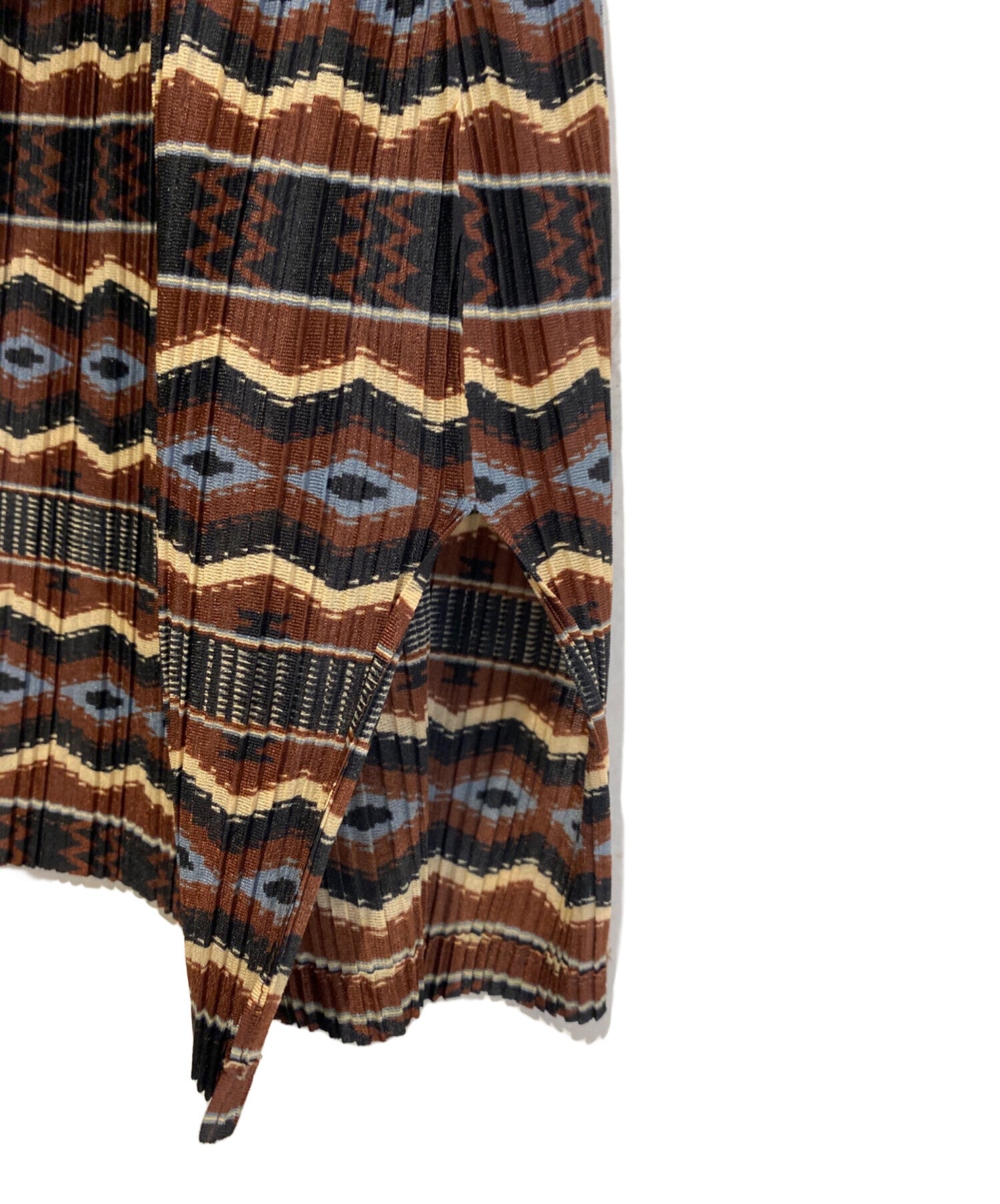 Comment This is a pleated blouse with an all-over ethnic pattern. It is a piece that is easy to wear with its calm brown-based coloring. The thin fabric is easy to use for layering and can be worn season after season.
