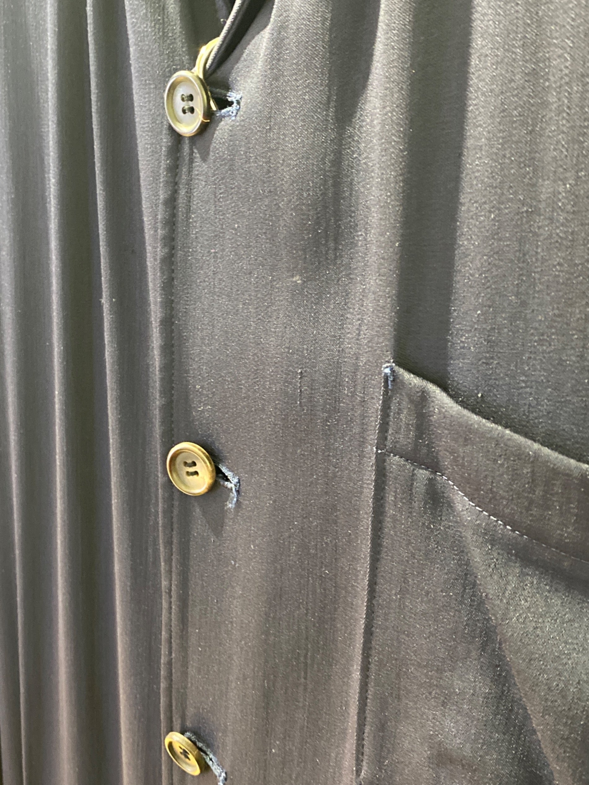Comment This shirtcoat is made of a rayon and wool base with an appealing thick texture. The open collar and drapey material are key points. Because of its thin texture, it can be used as a layering item for inner wear with a coat.