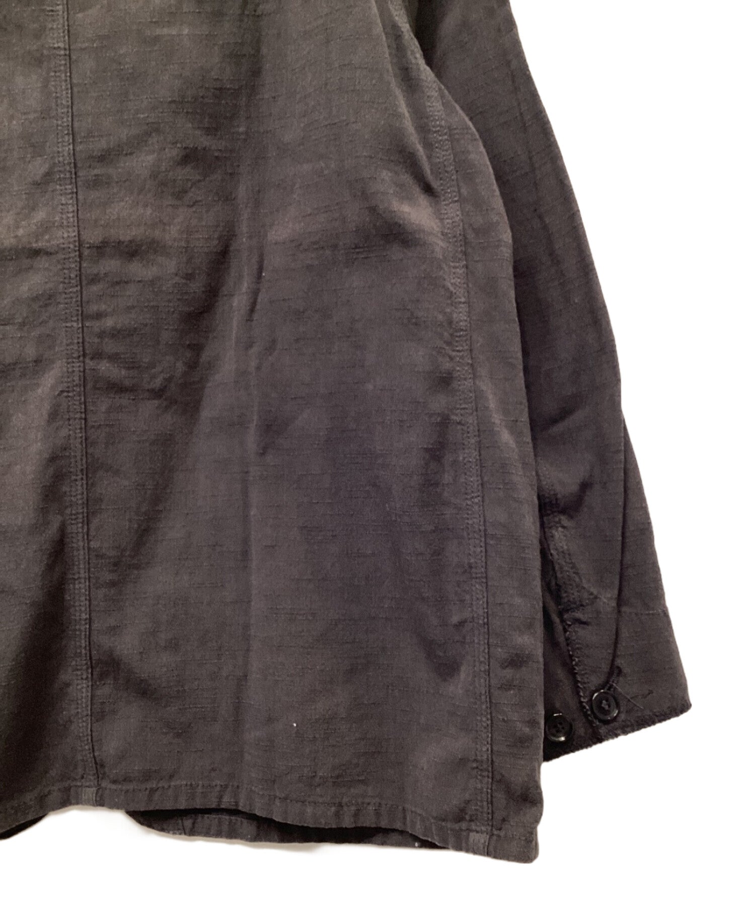 | Comment | Needles Chore Coat-Aizu-Tsumugi This is a cotton collarless jacket by Needles. The cotton fabric has a thin denim-like texture, and while the silhouette is clean, it has a military feel to it. |