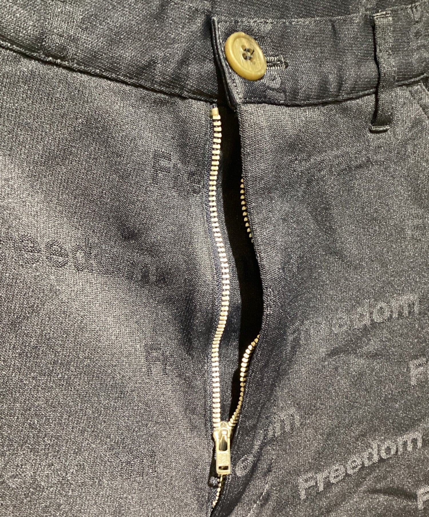 Comment These tapered slacks feature the FREEDOM logo all over. The frizzy fabrication is typical of COMME des GARCONS and adds an accent to the coordinated look. It is an easy-to-wear design that goes well with jacket set-ups and simple cut-and-sewns.