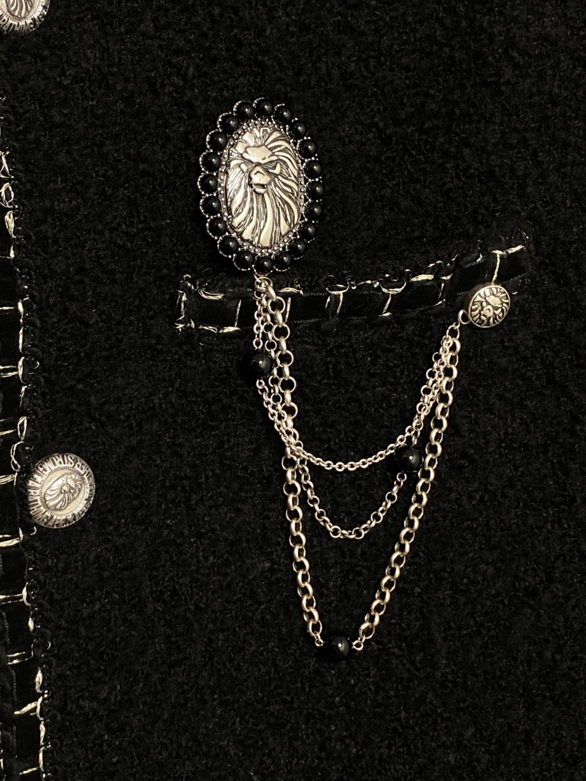 | Comment | This jacket is constructed of tweed fabric and decorated with various parts to give it a luxurious feel. It is a one-of-a-kind item that mixes street style and luxury. |