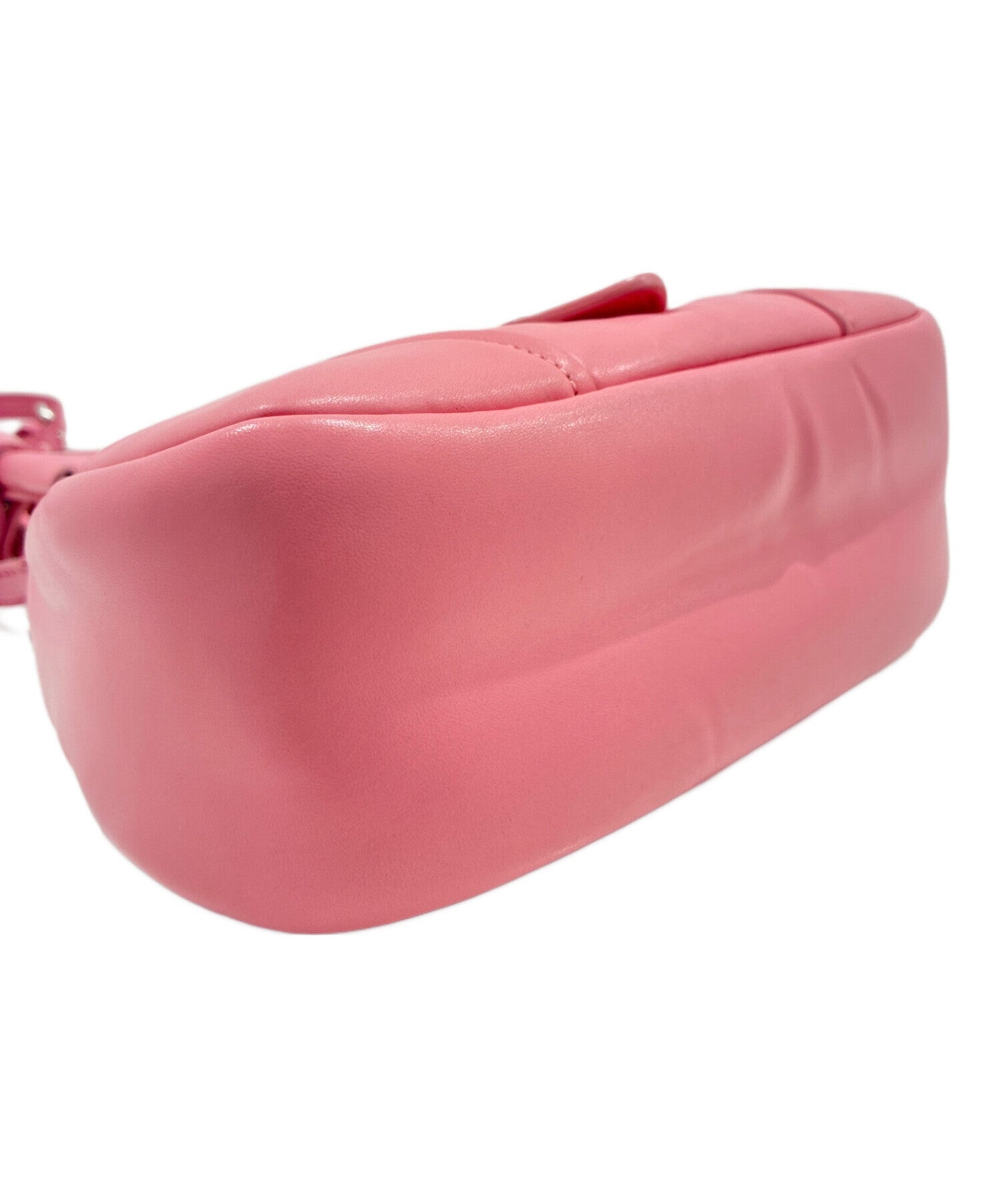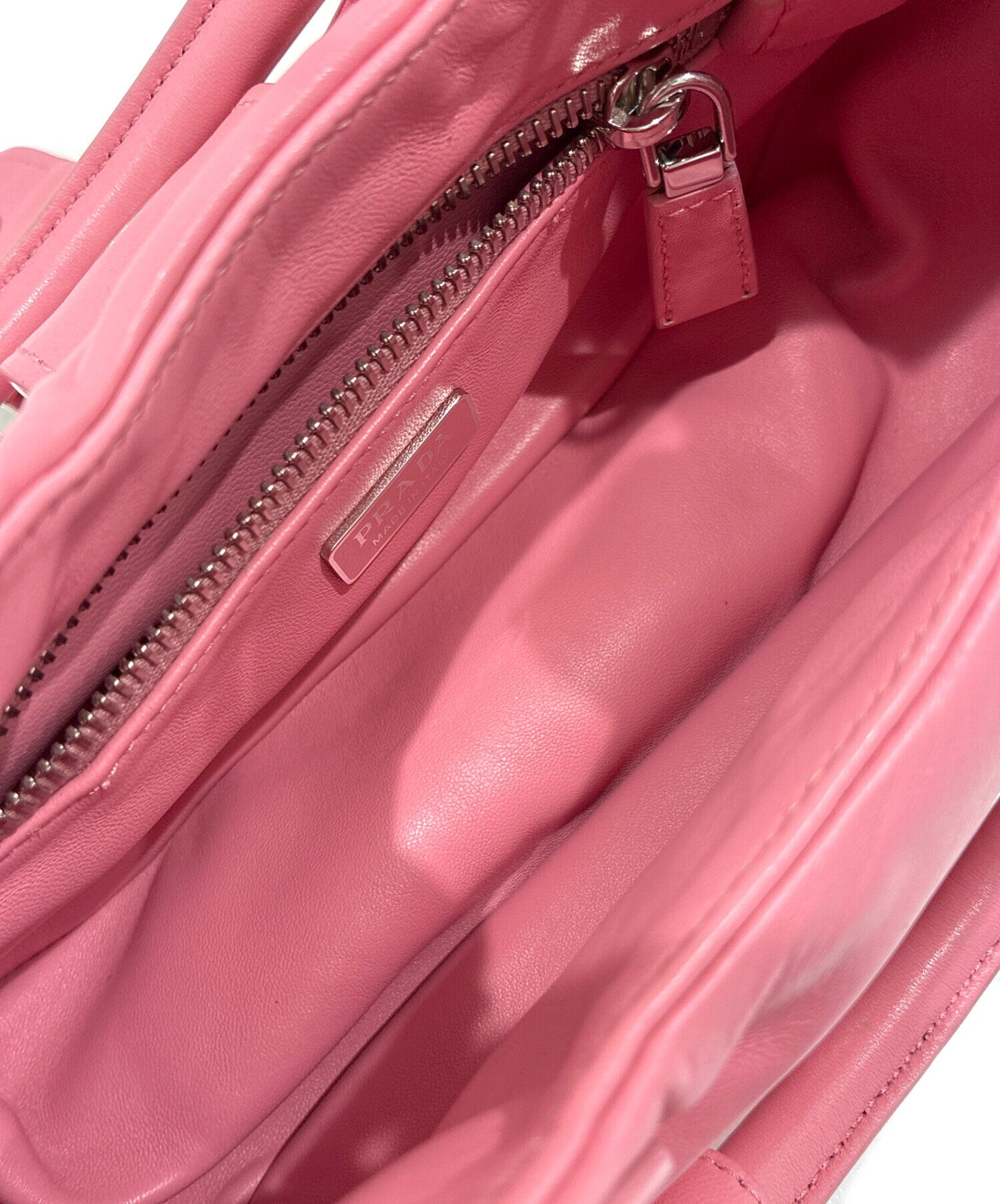 Comment The Saffiano triangle logo plate placed on the flap gives this shoulder bag an outstanding presence. The material used is padded leather with a characteristic plump texture, giving it a feminine touch of elegance. The vivid pink color makes it a recommended item that can be used as an accent in a variety of outfits.