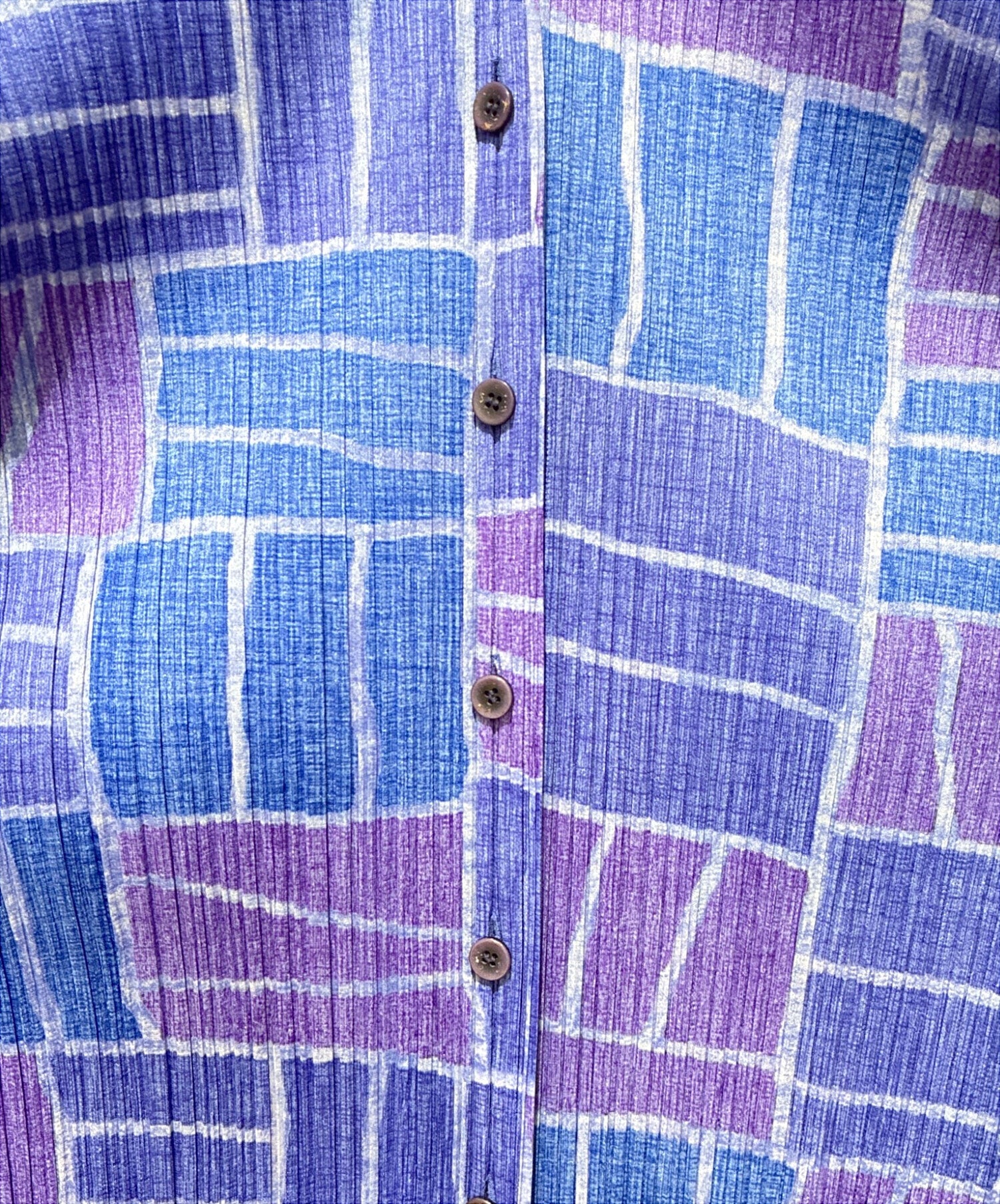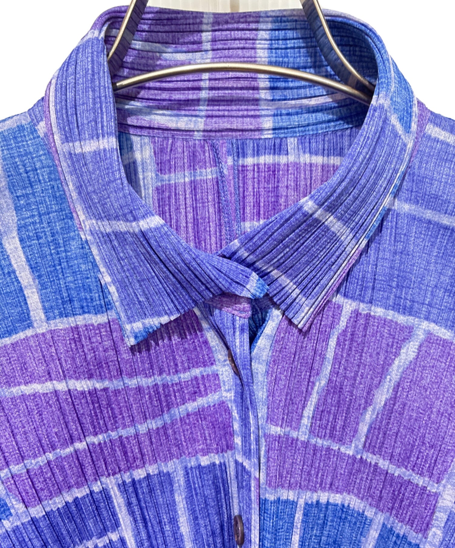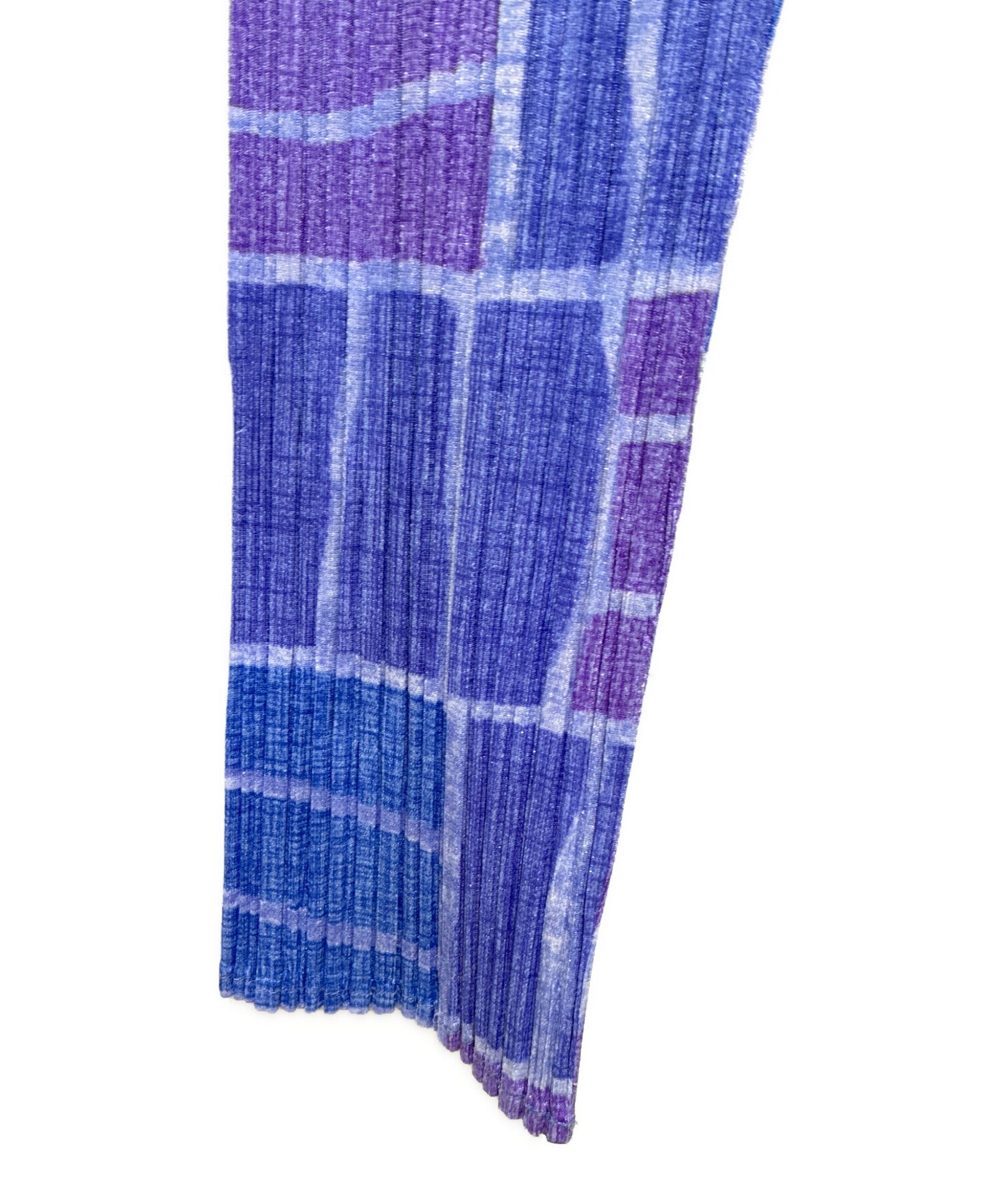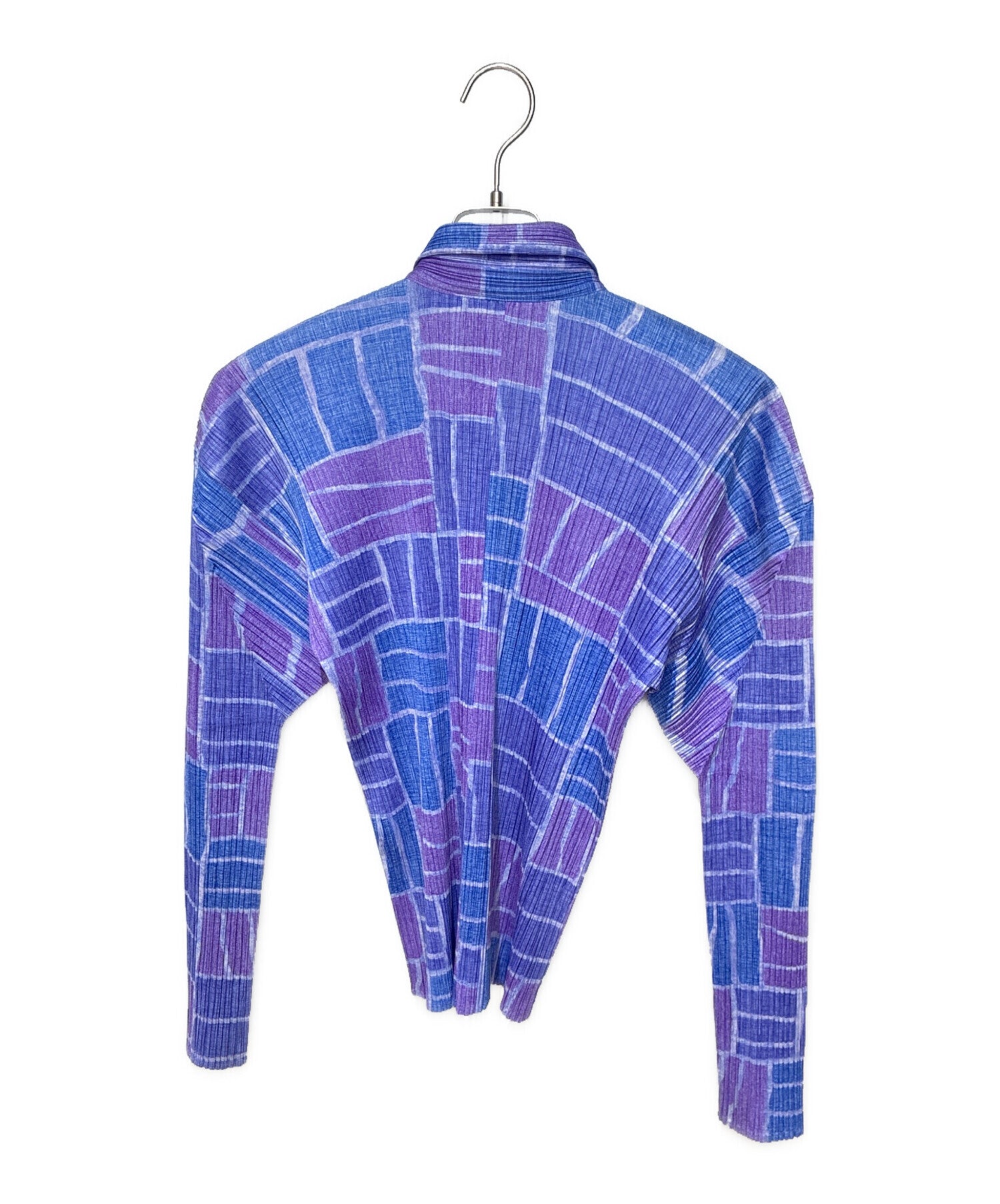Comment This is a long sleeve blouse with an all-over pleated pleats design. The blue and purple color scheme is elegant and can be worn alone. It is characterized by its elasticity and three-dimensionality.